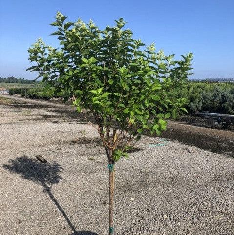 Limelight Hydrangea is a fast-growing upright deciduous shrub noted for its dense cone-shaped panicles and mixed yellow and green fall color. These large 8” panicles bloom white, mature to lime-green, and then acquire rose-pink tones before eventually fading to beige as its leaves turn. The flowers bloom all summer into fall and are very attractive to butterflies. Best bloom in partial sun and rich, moist well-drained soils.