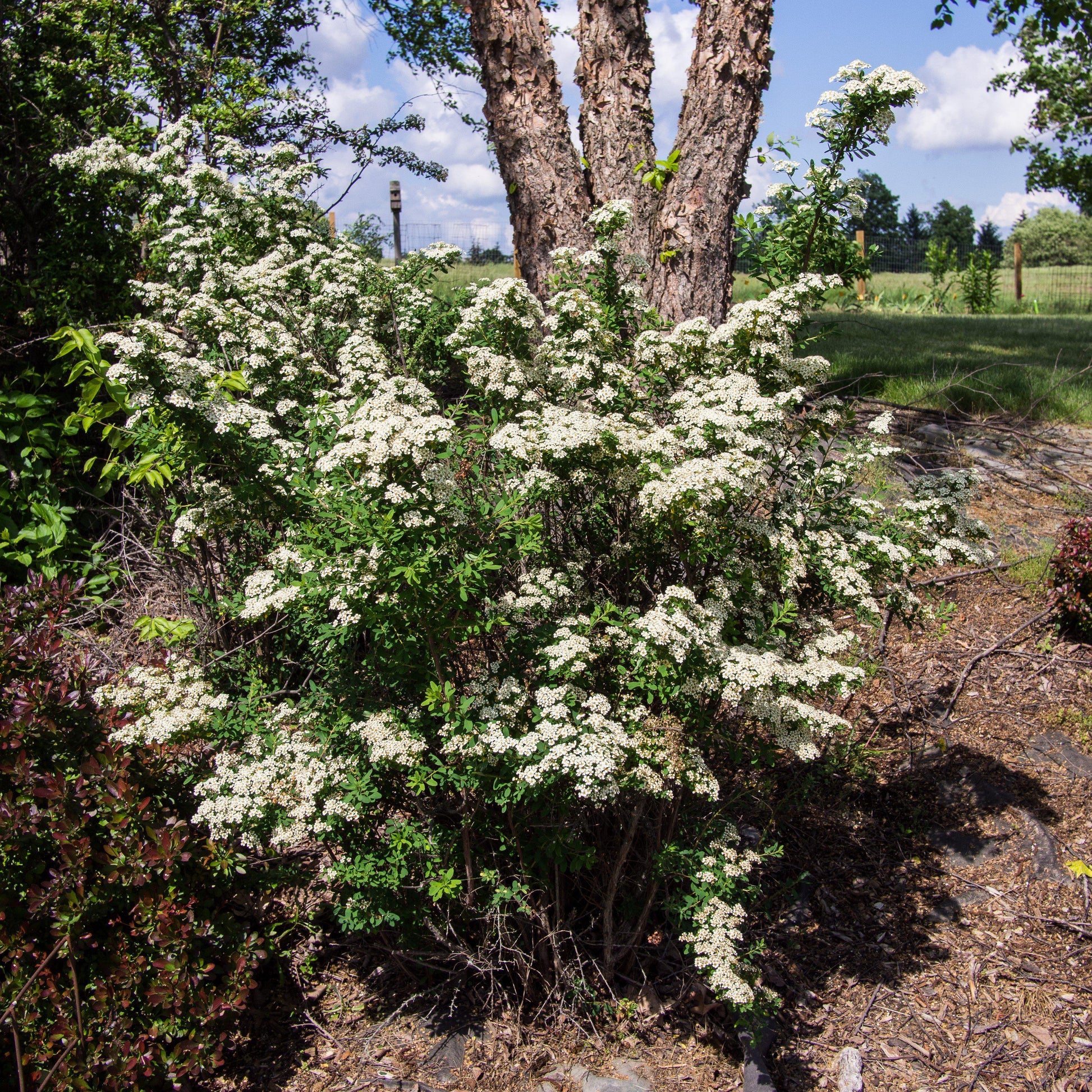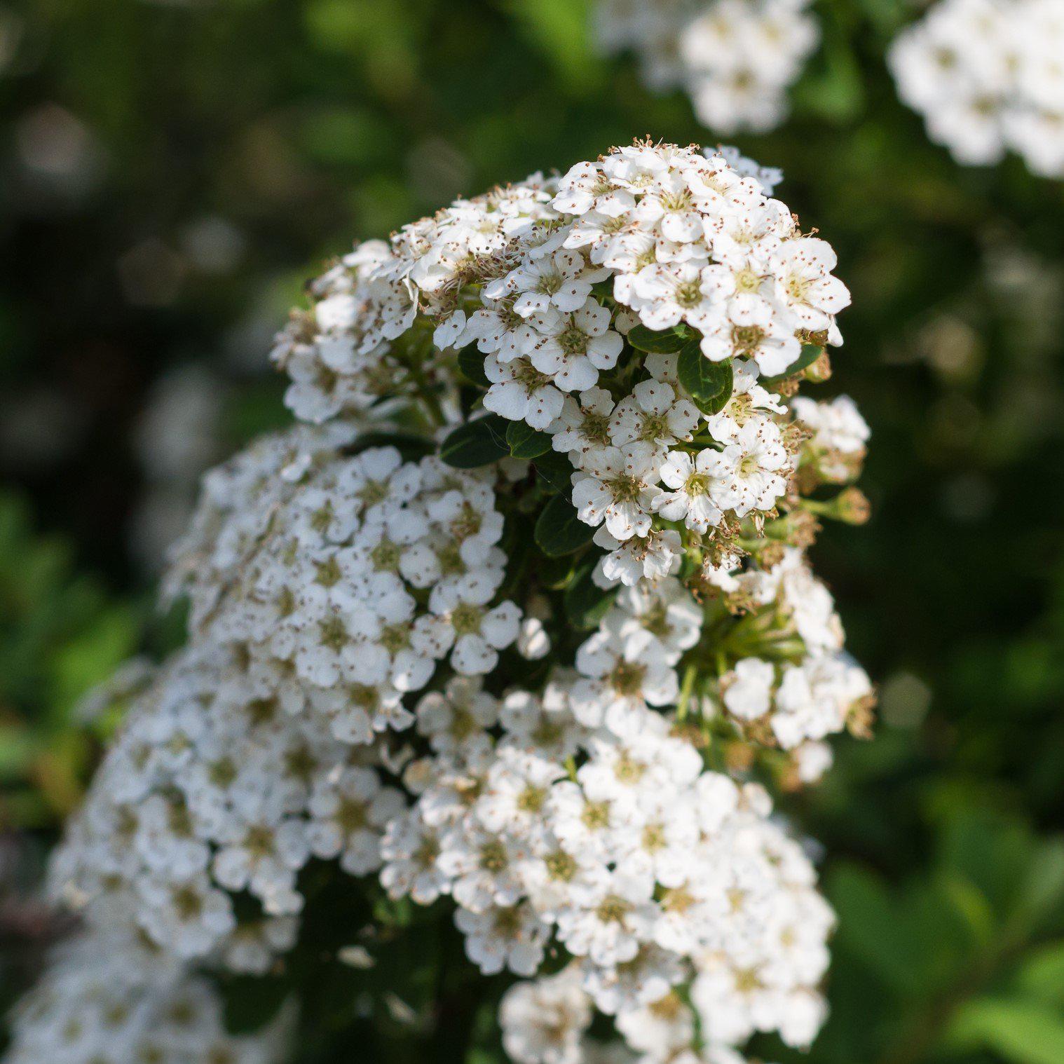Snowmound Spirea is a fast-growing deciduous shrub with a mounded habit and gracefully spreading branches. Its oval dark blue-green foliage emerges bright green and turns golden yellow in fall. Flat-topped clusters of clear white flowers cover the plant in later spring to summer. Grows best with partial sun in the South and well-drained soils.